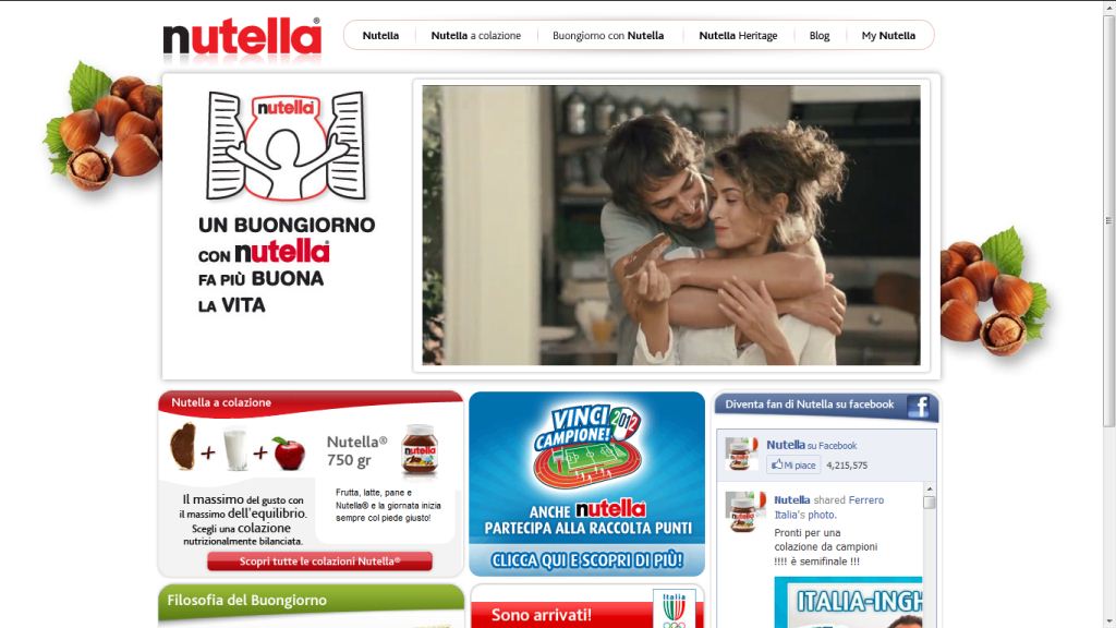 The Italian site plays you a video with opera-like, Nutella-praising vocals on the soundtrack. I’ve seen many times that Italian marketing has fun playing with opera-related clichés. The people depicted here are healthy-looking, youthful adults. No families with children, which you see on the U.S. and German sites. Italian Nutella wants to be cool and sexy, whereas U.S. and German Nutella aims for a happy family around the breakfast table. And, as you probably know, many contemporary Italians are reluctant to have children. With all the different graphical elements, I find the Italian Nutella homepage a bit too busy (but I’m from Germany, of course) and didn’t want to stay long, but it’s very typical for Italian consumer marketing.