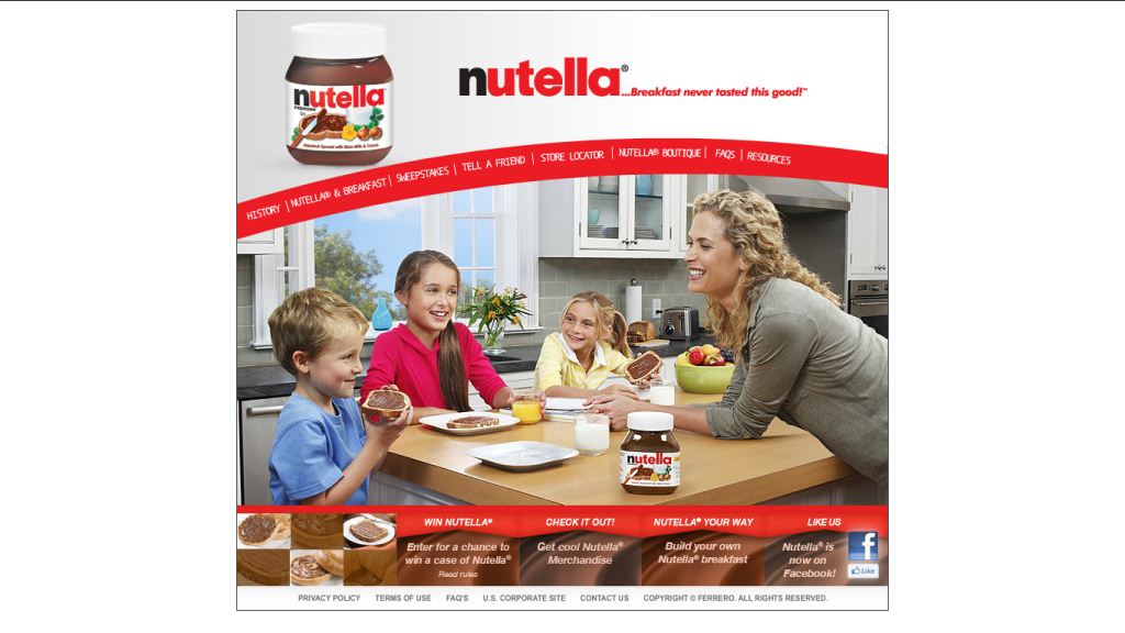 They are all smiling. Each of the children has an untouched slice of white bread with Nutella, smeared with great regularity, no closer to the edge of the bread than about an inch. Links above and clickable graphics below take you to content about the product’s history, sweepstakes, merchandise, and Facebook page.
